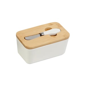Recipiente para barras de mantequilla fabricado en cerámica y tapa de madera con función hermética y espacio para almacenar el cuchillo. Incluye cuchillo untador.